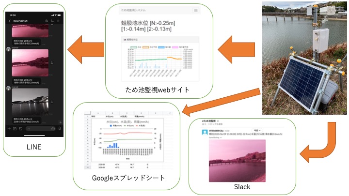 本マニュアルではSlack、Googleスプレッドシートとの連携方法、ため池監視webサイトの作成方法、webサイトを利用したLINEとの連携方法を説明します(第六章)。また、それ以外にも様々なサービスと連携可能です。