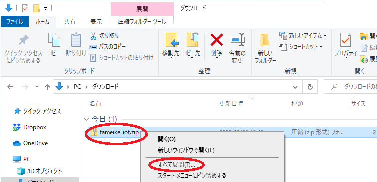 ダウンロードフォルダを開き、「tameike_iot.zip」ファイルを右クリックし、「すべて展開(T)…」メニューをクリックします。