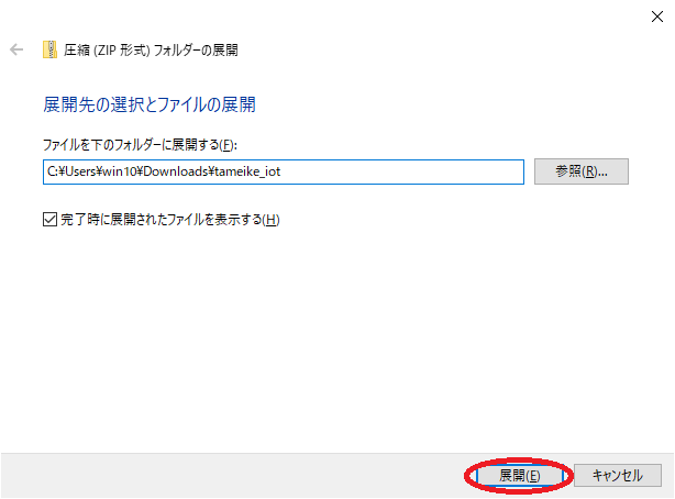 展開先の選択とファイルの展開ウィンドウが表示されますので、「展開(E)」ボタンをクリックします。