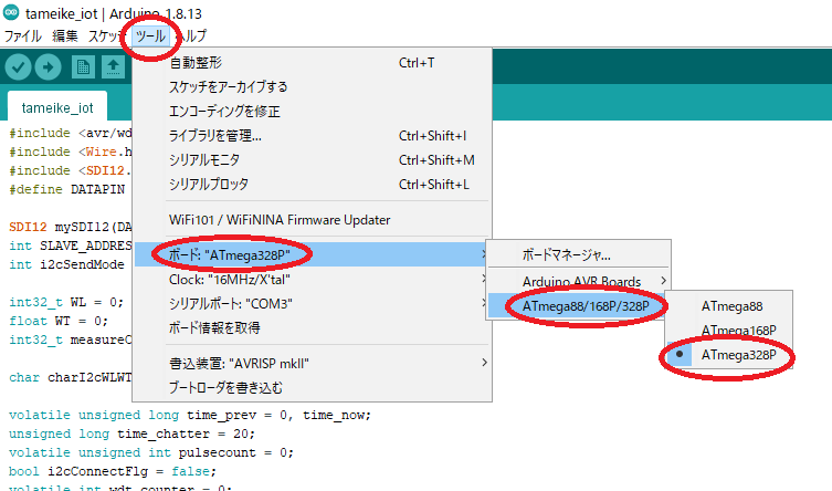 Arduino IDEが起動しますので、書き込み先のボード設定を行います。「ツール」メニュー、「ボード:」、「ATMEGA88/168P/328P」、「ATMEGA328P」をクリックします。