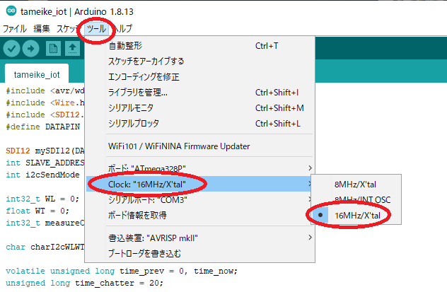 クロックの設定を行います。「ツール」メニュー、「Clock:」、「16MHz/X’tal」をクリックします。