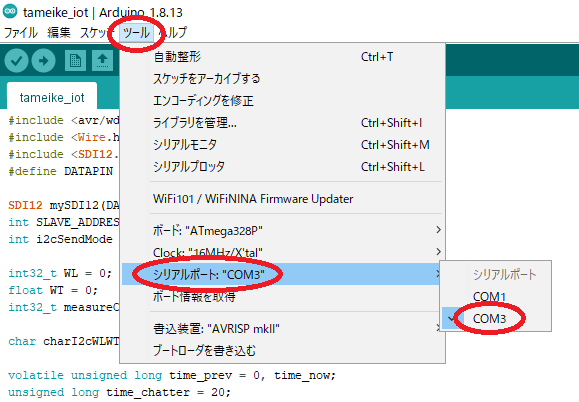 シリアルポートの設定を行います。「ツール」メニュー、「シリアルポート」、「COM3」をクリックします。