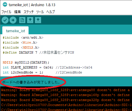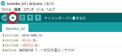 「tameike_iot.ino」ファイルをダブルクリックし、プログラムファイルを開きます。