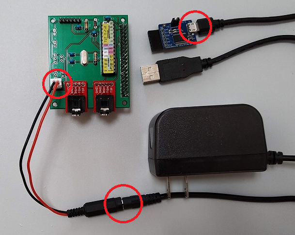 回路基板、電源コード、ACアダプター、USBシリアル変換アダプター、micro usbケーブルを準備します。画像のように電源コードを回路基板に接続し、ACアダプターを電源コードに接続します。その後、USBシリアル変換アダプターにmicro usbケーブルを接続します。