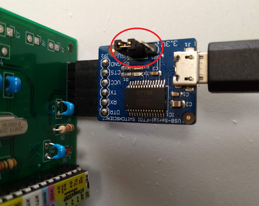 USBシリアル変換アダプターのジャンパーピンが5V側に接続されていることを確認し、画像のように回路基板のヘッダーピンに接続します。その後、ACアダプターをコンセントに接続し、最後にUSBケーブルをPCに接続します。