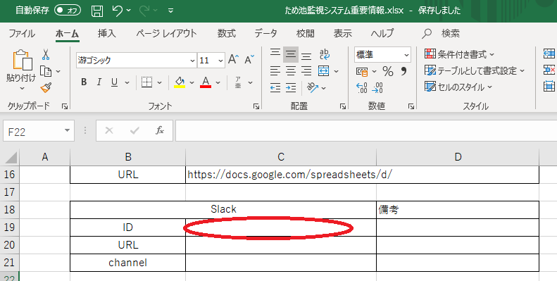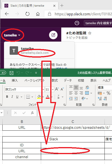 最後にSlackのURLをため池監視システム重要情報エクセルファイルに記載します。画面左側「tameike」をクリックし情報を表示後、「xxxxxx.slack.com」部分をSlack、URL欄に記載します。
