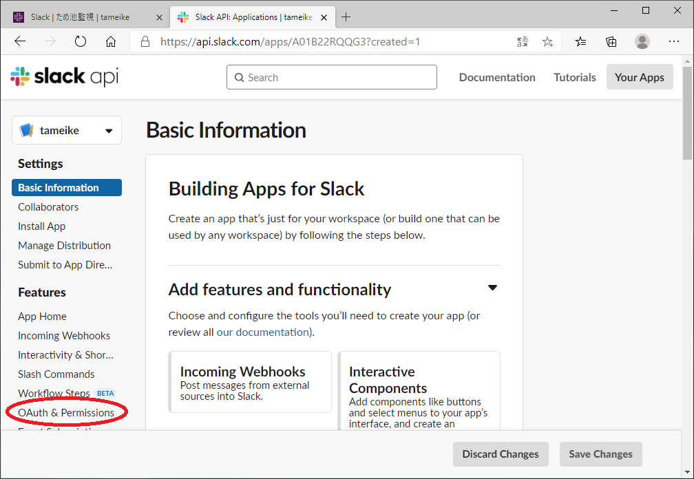 Basic Informationウィンドウが表示されますので、Featuresメニュー内、「OAuth & Permissions」メニューをクリックします。