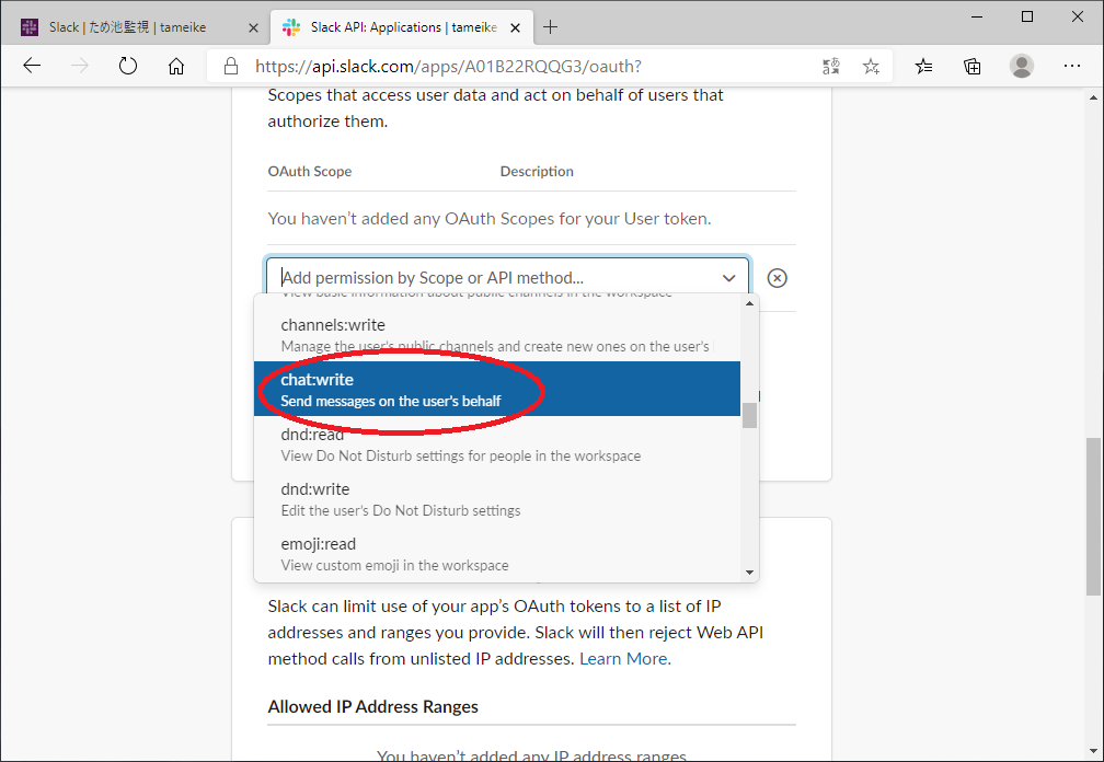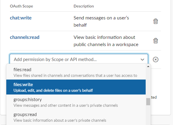 再度「Add an OAuth Scope」ボタンをクリックし、「files:write」をクリックします。