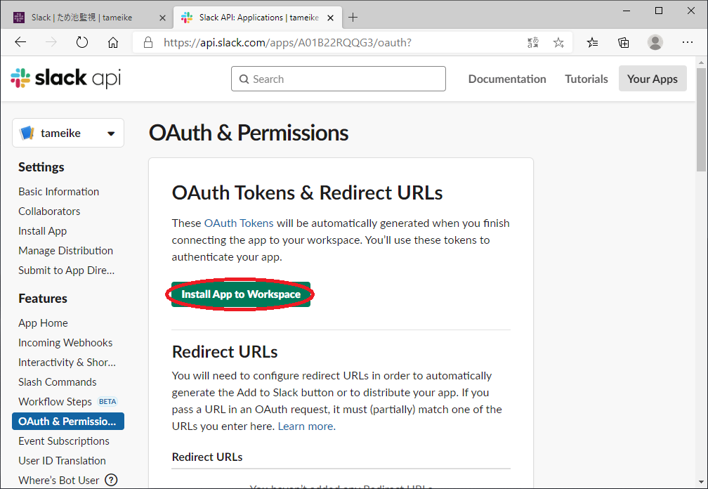 同じページ内、一番上にスクロールし、「Install App to Workspace」ボタンをクリックします。