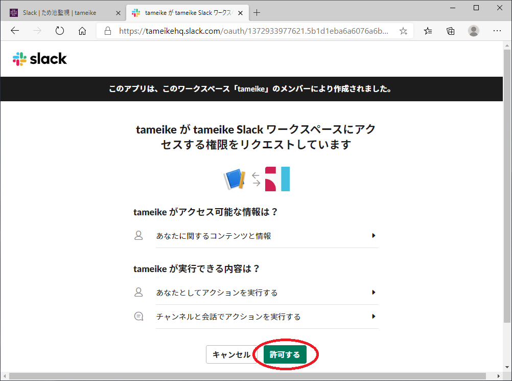 tameikeがtameike Slack ワークスペースにアクセスする権限をリクエストしていますウィンドウが表示されますので、「許可する」ボタンをクリックします。