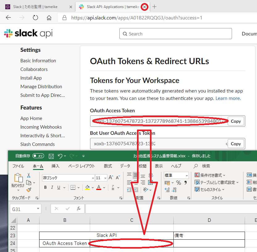 リクエストの許可完了後、「OAuth Access Token」をため池監視システム重要情報エクセルファイルに記載します。記載完了後、「×」をクリックし、閉じます。