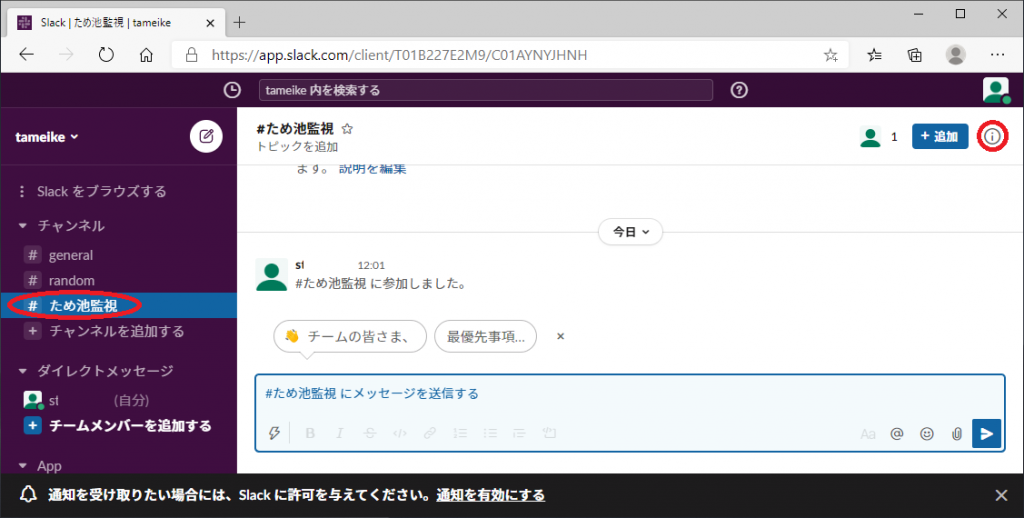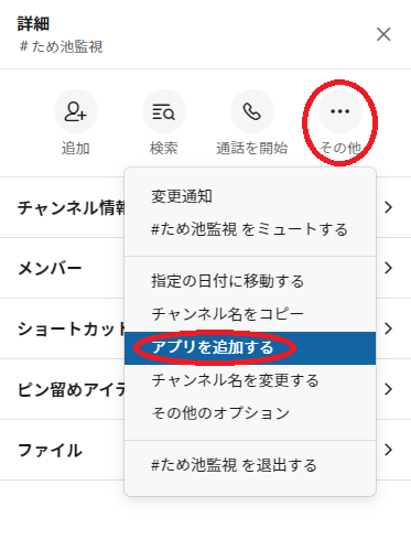 追加完了後、ため池監視チャンネルが表示されますので、URL内のチャンネルIDをため池監視システム重要情報エクセルファイル、Slack内channelに記載します。記載する部分は、https://app.slack.com/client/xxxxxx/yyyyyy/details/top