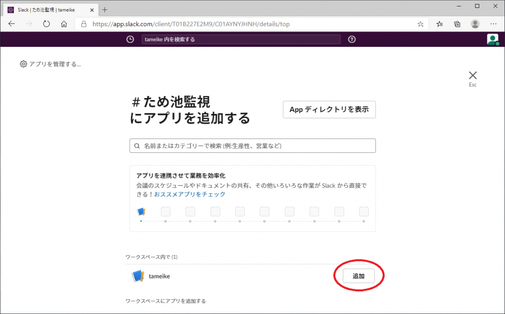 #ため池監視にアプリを追加するウィンドウが表示されますので、画面下、「ワークスペース内で(1)」内のtameike、「追加」ボタンをクリックします。