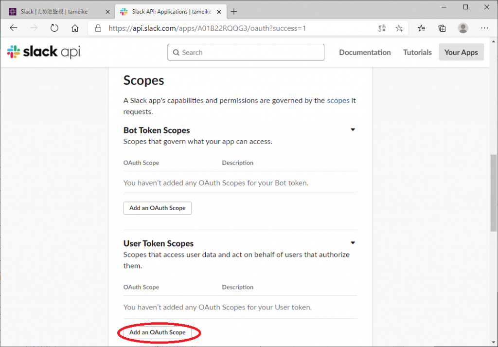 OAuth & Permissionsウィンドウが表示されますので、下にスクロールし、Scopes欄内、User Token Scopesの「Add an OAuth Scope」ボタンをクリックします。