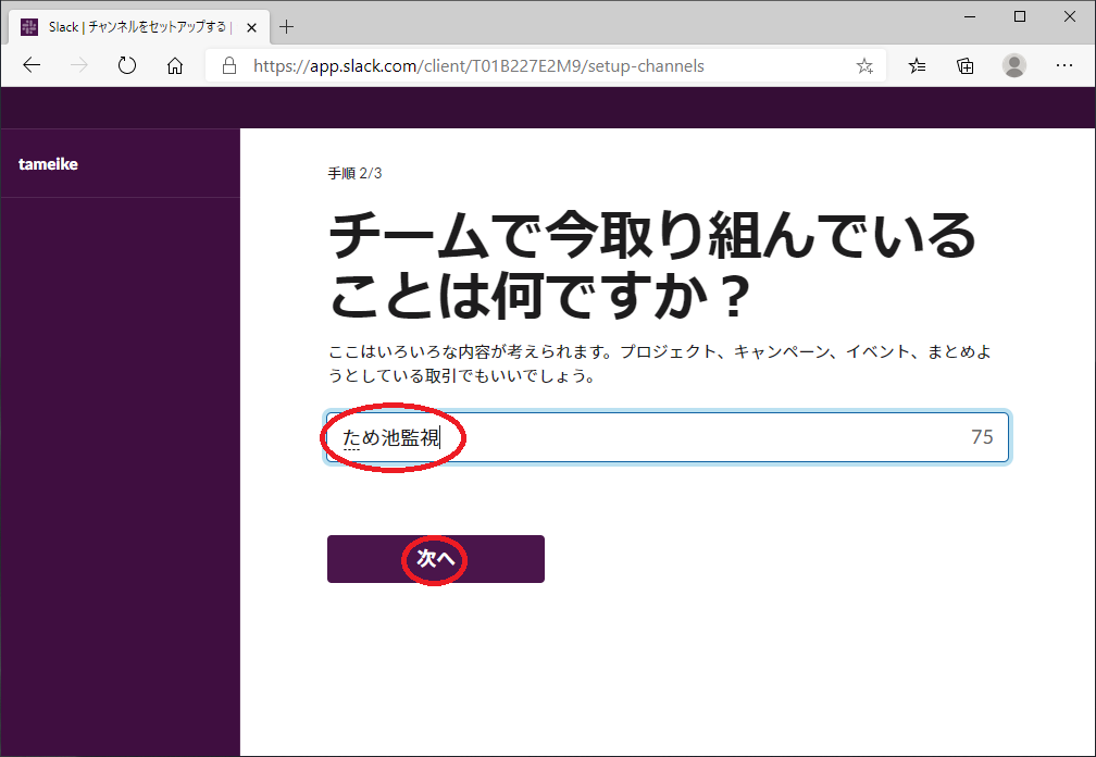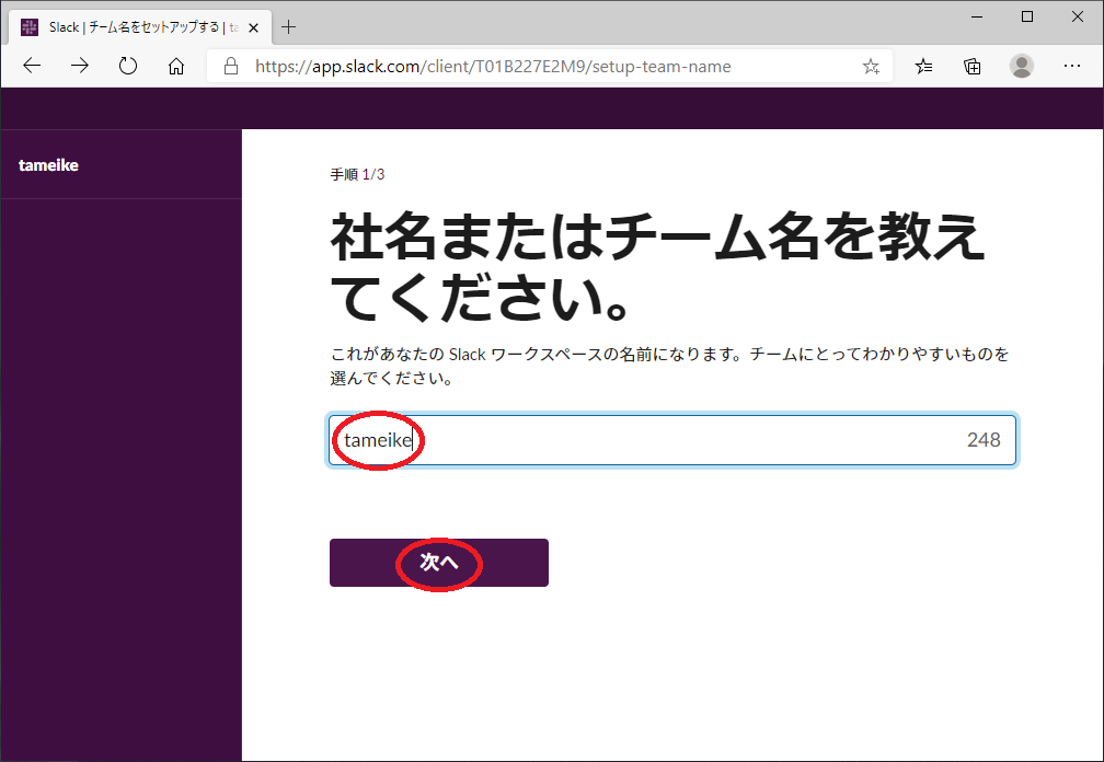 社名またはチーム名を教えてください。ウィンドウが表示されますので、「tameike」と入力し、「次へ」ボタンをクリックします。