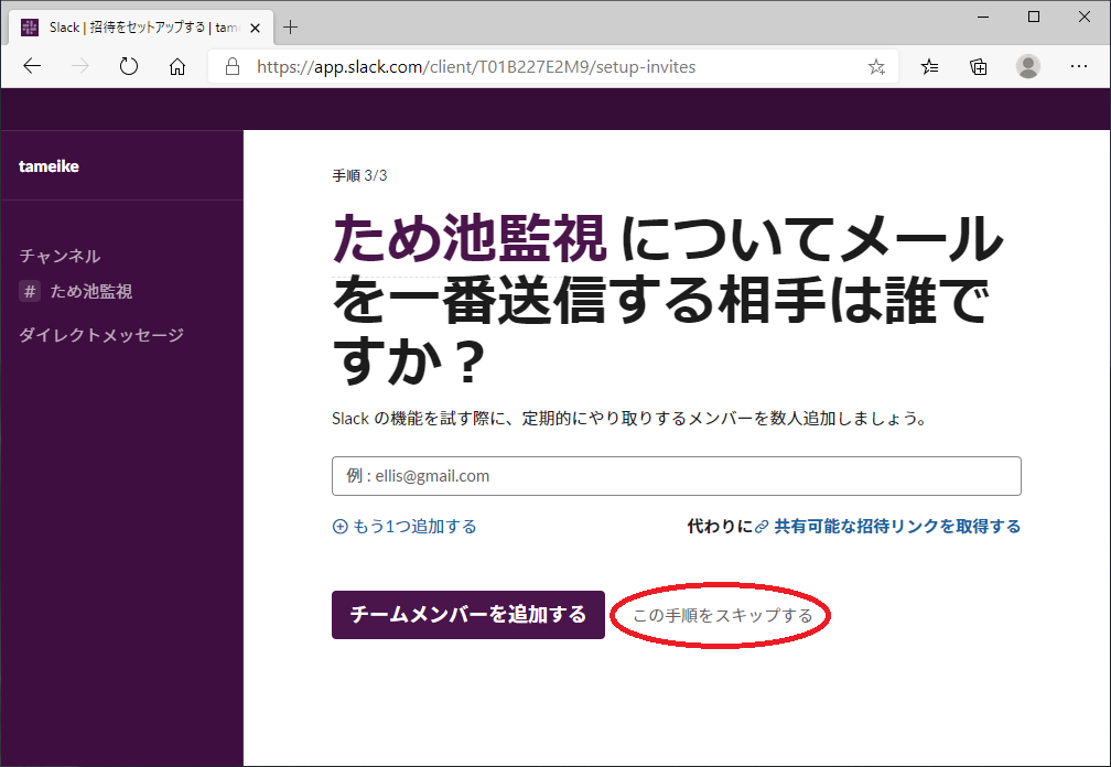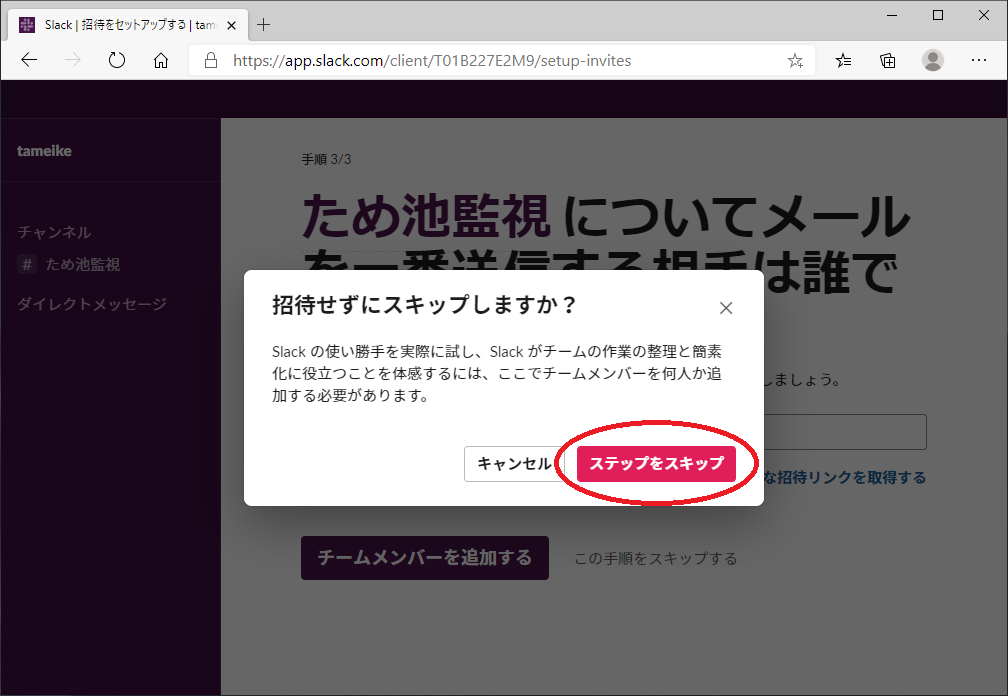 招待せずにスキップしますか?ウィンドウが表示されますので、「ステップをスキップ」ボタンをクリックします。