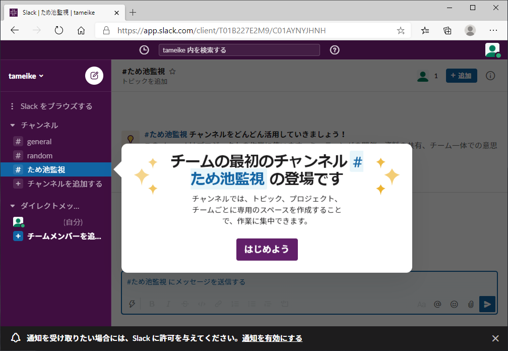 Slackの作成が完了し、Slackウィンドウが表示されます。