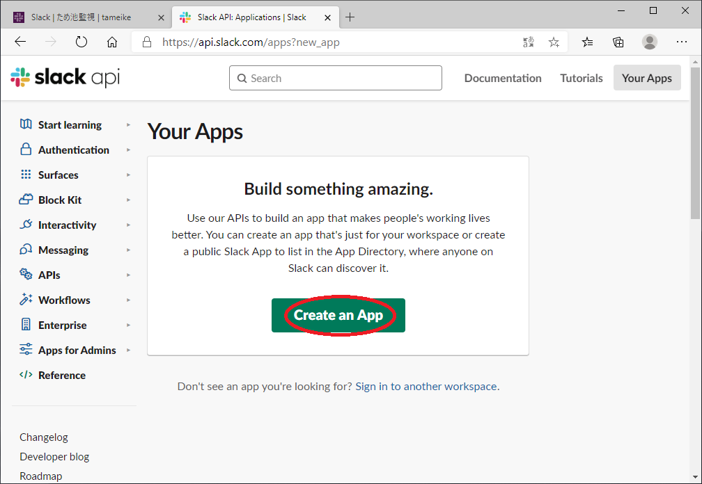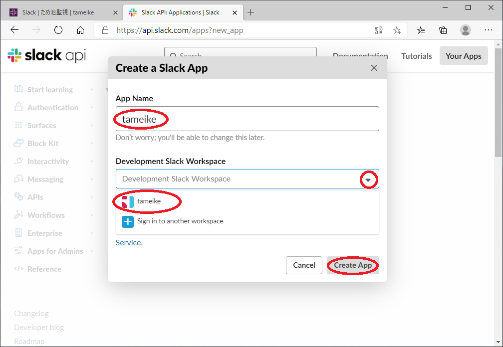 「Create a Slack App」ウィンドウが表示されますので、App Nameに「tameike」と入力し、Development Slack Workspaceに右側▼をクリックし、「tameike」を選択します。その後、「Create App」ボタンをクリックします。
