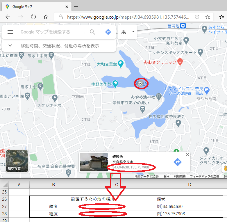 表示した緯度・経度情報を、ため池監視重要情報エクセルファイル、設置するため池の場所、緯度・経度欄に入力します。