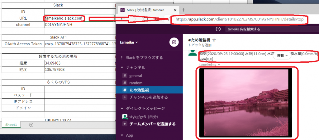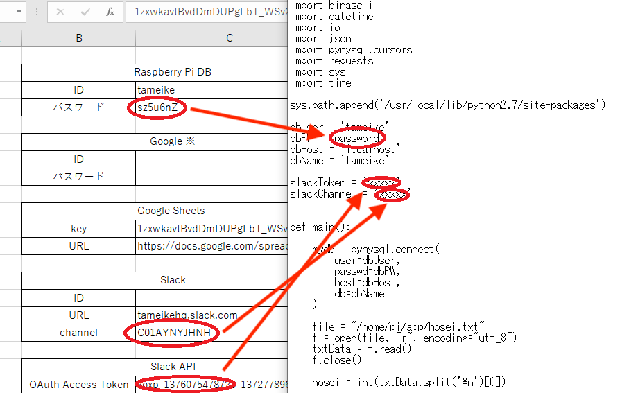 ため池監視重要情報エクセルファイル、Raspberry Pi DBパスワードをdbPWに、Slack channelをSlackChannelに、Slack API Oauth Access TokenをSlackTokenに入力後、「ファイル」メニュー「上書き保存(S)」をクリックし、保存します。
