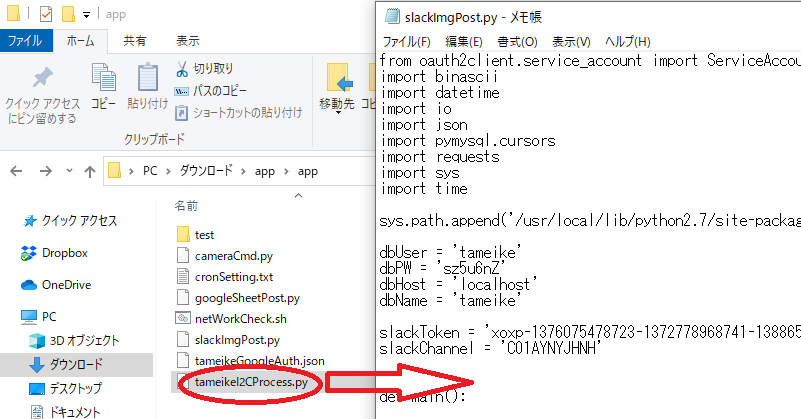 保存完了後、「slackImgPost.py」をメモ帳にドラッグ&ドロップし、開きます。