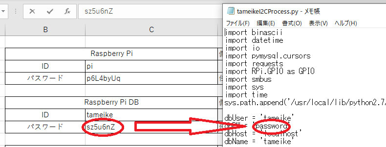 ため池監視重要情報エクセルファイル、Raspberry Pi DBパスワードをdbPWに入力後、「ファイル」メニュー「上書き保存(S)」をクリックし、保存します。