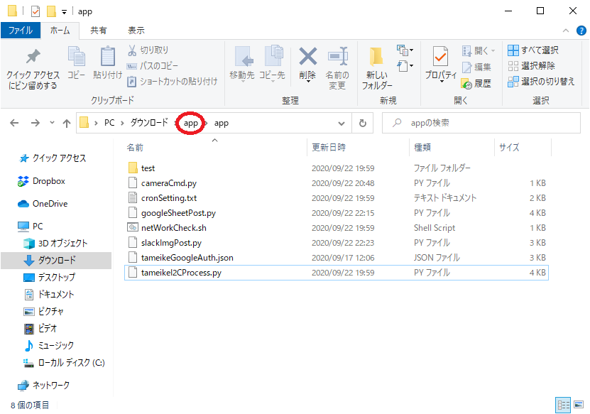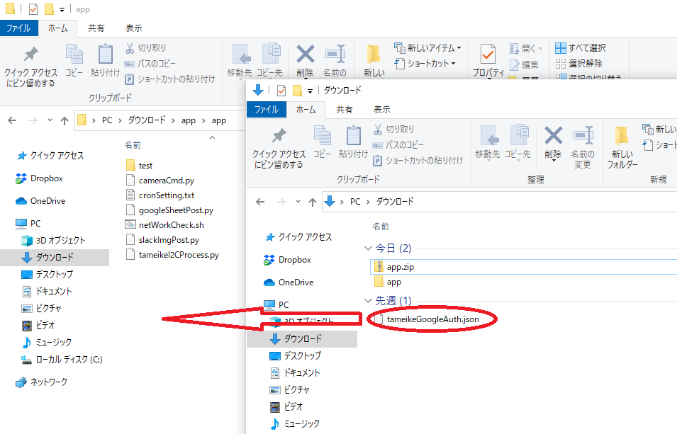 開いたappフォルダに、ダウンロードフォルダ内にある「tameikeGoogleAuth.json」(第六章:情報の可視化(Google スプレッドシートの使用準備)で作成したもの)をドラッグ&ドロップし、appフォルダに移動します。