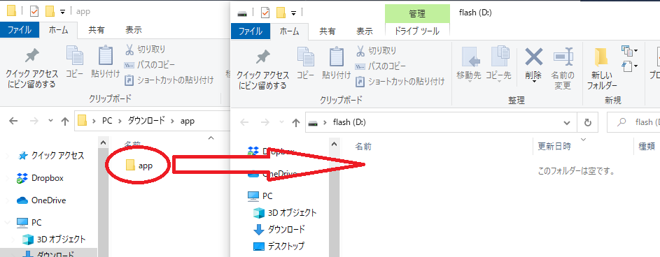 USBフラッシュメモリ(第五章で使用したもの)をPCに挿入後、appフォルダをフラッシュメモリに移動します。その後、USBフラッシュメモリをPCから抜きます。
