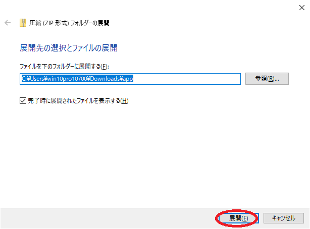 展開先の選択とファイルの展開ウィンドウが表示されますので、「展開(E)」ボタンをクリックします。