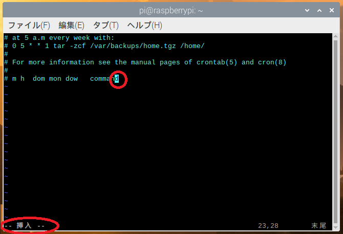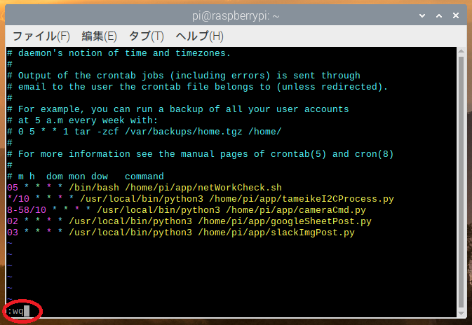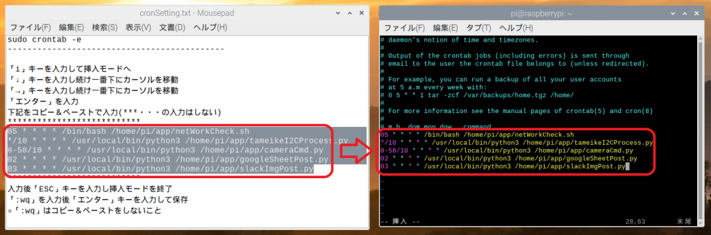 03 * * * * /usr/local/bin/python3 /home/pi/app/slackImgPost.pyLXTerminal内をクリックし、「Shift」+「Ctrl」+「v」キーを同時に入力し貼り付けます。