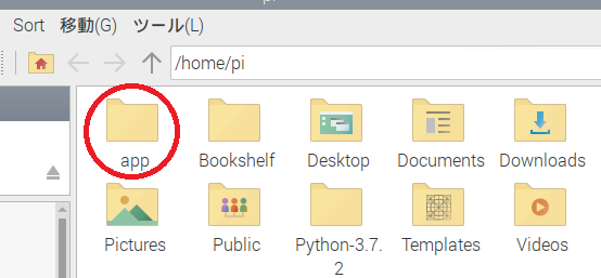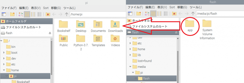 リムーバブルメディア(USBフラッシュメモリ)内の、appフォルダをpiフォルダにドラッグ&ドロップし、appフォルダを移動します。