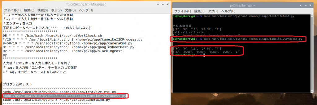 sudo /usr/local/bin/python3 /home/pi/app/tameikeI2CProcess.pyをコピーし、LXTerminalに貼り付け、「エンターキー」を入力し実行します。
