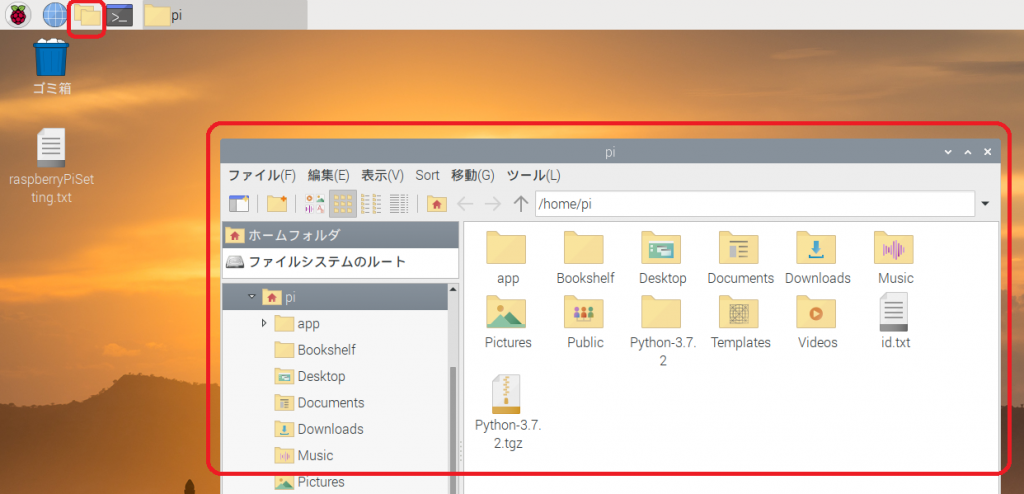 画面左上「ファイルマネージャ」をクリックし、piフォルダを開きます。