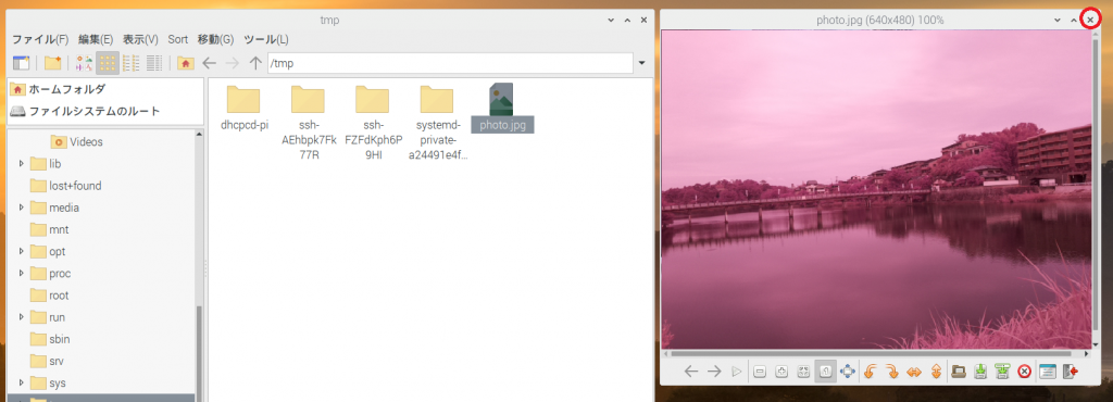 ファイルマネージャー左側を下にスクロールし、「tmp」フォルダをクリックします。tmpフォルダが表示されますので、「photo.jpg」ファイルをダブルクリックし、画像ファイルを開きます。