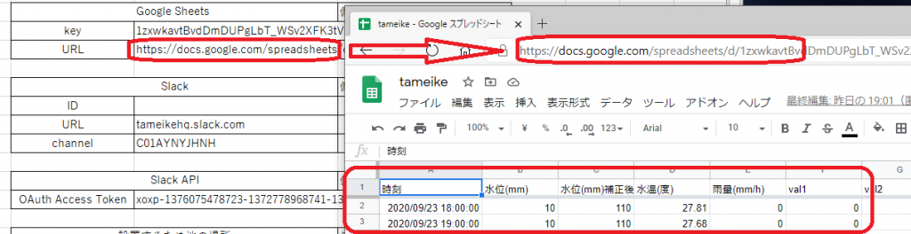 2時間経過後、ため池監視システム重要情報エクセルファイル内、Google Sheets URLをコピーし、ブラウザに貼り付けGoogleスプレッドシートを開きます。スプレッドシートに、正常に情報が入っているか確認します。