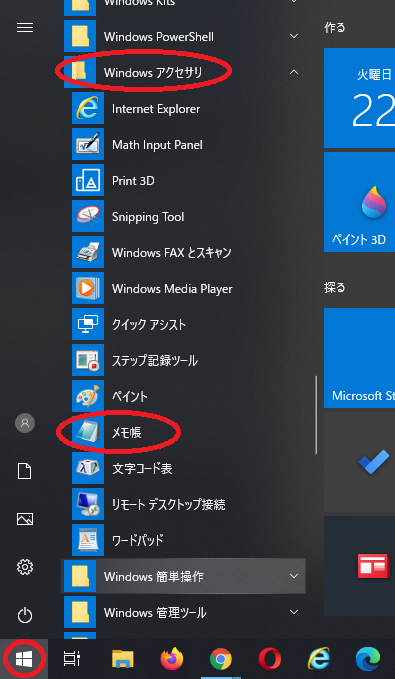 または、「スタート」ボタンをクリックし、「メモ帳」と入力後、「メモ帳」をクリックすると起動します。