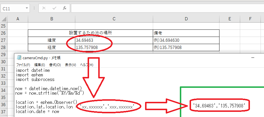 使用する赤外線カメラモジュールは、日中と夜間でシャッタースピードや輝度等の各パラメータを調整する必要があります。その為、日の出日の入時刻を算出する為に、ため池の緯度・経度情報が必要となります。
