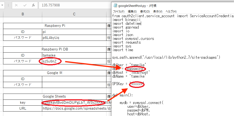 ため池監視重要情報エクセルファイル、Raspberry Pi DBパスワードをdbPWに、Google Sheets keyをSPSKeyに入力後、「ファイル」メニュー「上書き保存(S)」をクリックし、保存します。