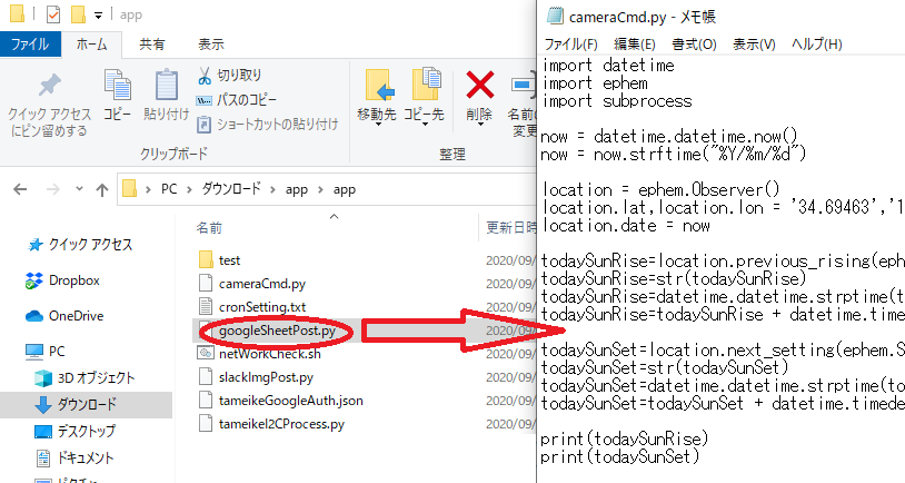 保存完了後、「googleSheetPost.py」をメモ帳にドラッグ&ドロップし、開きます。