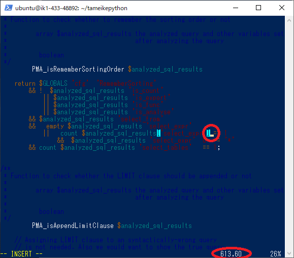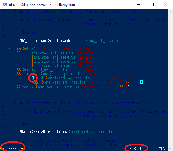 テキストエディタに切り替え後、「i」キーを入力してモードを「– INSERT –」モードへ変更します。その後、「PageDown」キーや「↓」キー、「→」キーを入力しカーソルを613行目16「(」まで移動します。
