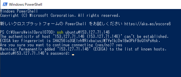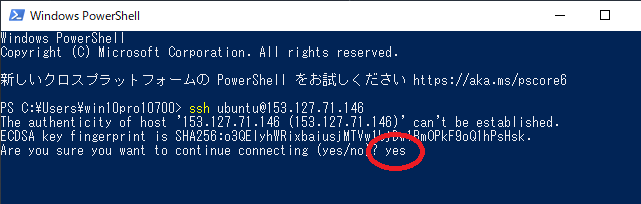 「Are you sure you want to continue connecting (yes/no)?」と表示されますので、「yes」と入力し、「エンターキー」を入力します。