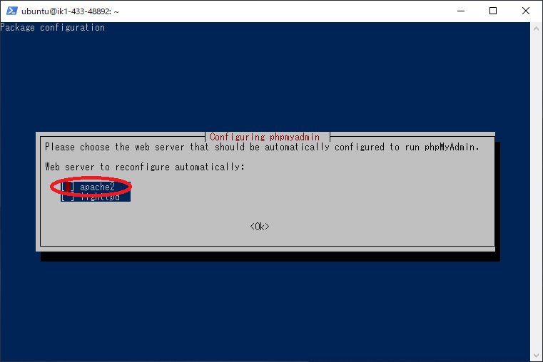 「Web server to reconfigure automatically:」と表示されたら、「apache2」にチェックが入っていることを確認し、「エンターキー」を入力します。