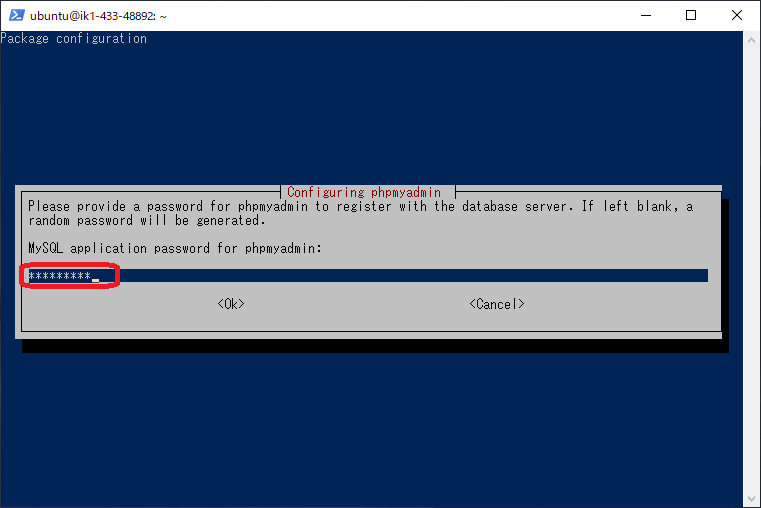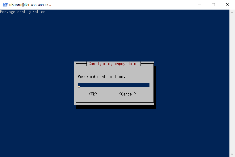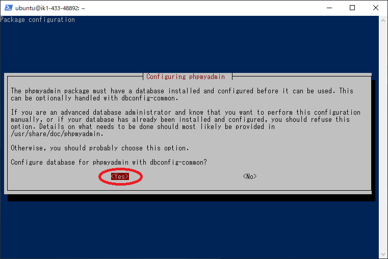「configure database for phpmyadmin with dbconfig-common?」と表示されたら、「<Yes>」が選択されていることを確認し、「エンターキー」を入力します。