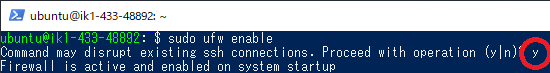 ※「sudo ufw enable」実行時、「Command may disrupt existing ssh connections.Proceed with operation (y|n)?」と表示されたら、「y」を入力し、「エンターキー」を入力します。