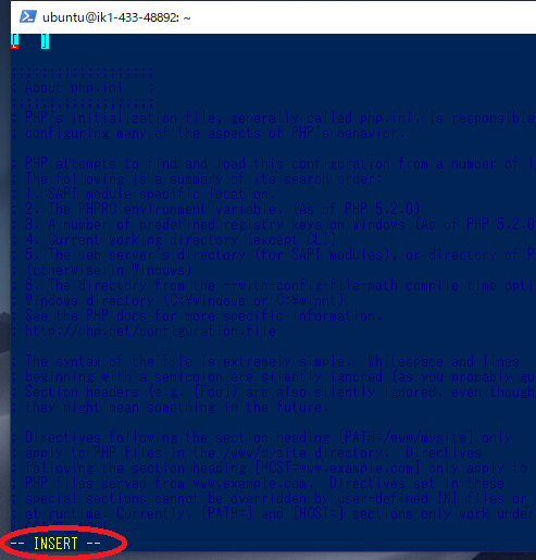 テキストエディタに切り替わるので、「i」キーを入力してモードを– INSERT –モードへ変更します。