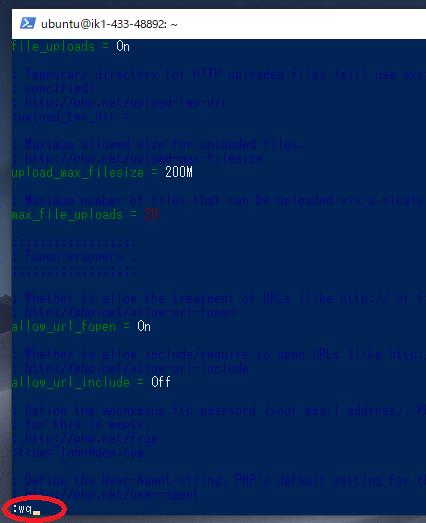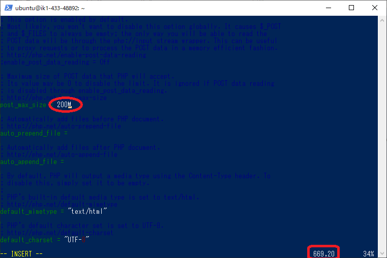 「PageDown」キーや「↓」キーを入力し、669行目までカーソルを移動します。移動後、post_max_size = 8Mの最後のMへ「→」キーを入力し、カーソルを移動後、バックスペースキーで削除し、「200」と入力します。
