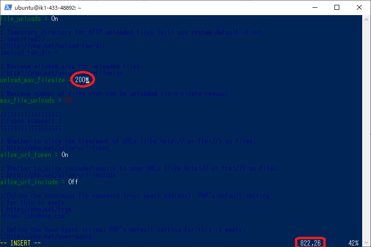 同様に822行目までカーソルを移動します。移動後、upload_max_filesize = 2Mの最後のMへ「→」キーを入力し、カーソルを移動後、「00」と入力し、「upload_max_filesize = 200M」にします。