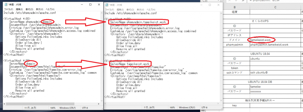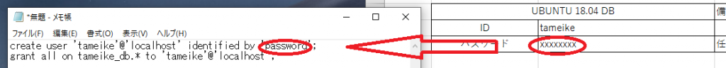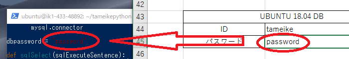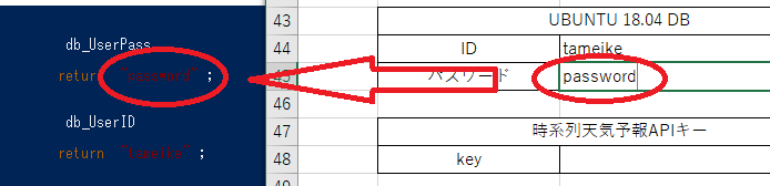 「passowrd」箇所を削除し、ため池監視システム重要情報エクセルファイルのUBUNTU 18.04 DB欄のパスワードを入力します(シングルクォーテーションは残す)。