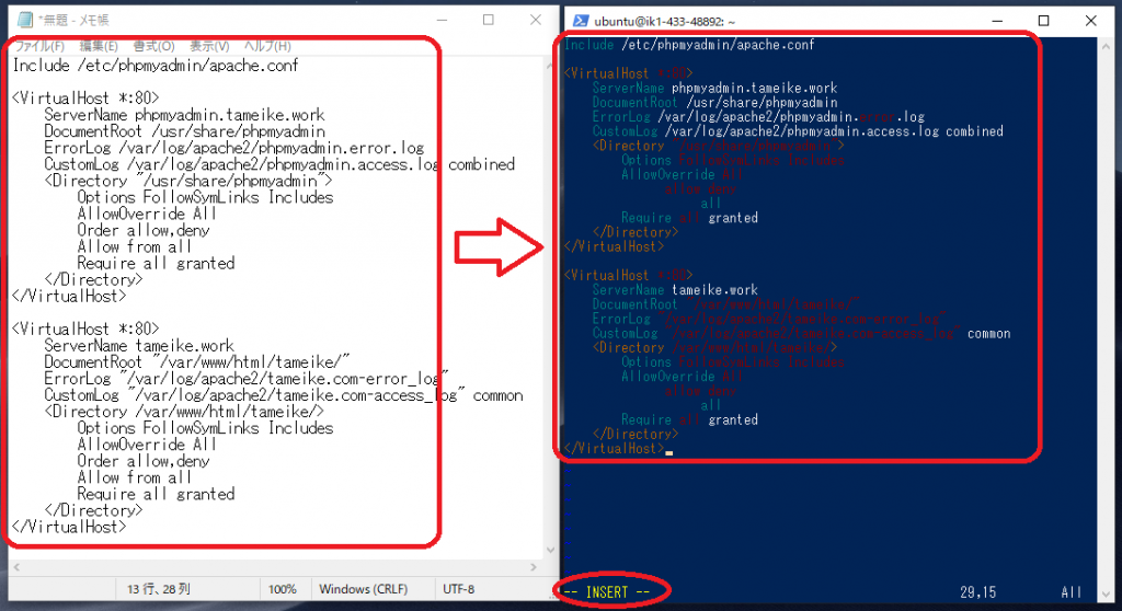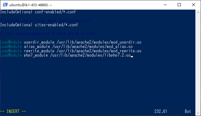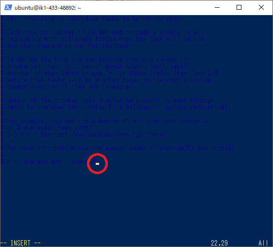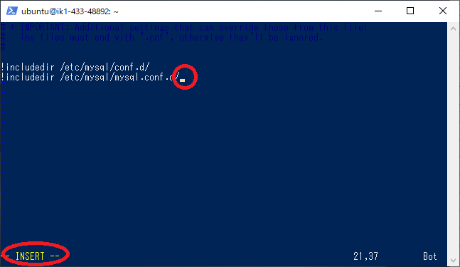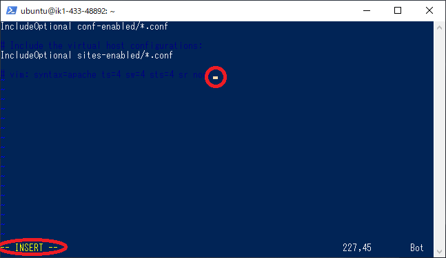 テキストエディタに切り替え後、「i」キーを入力してモードを「– INSERT –」モードへ変更します。その後、「PageDown」キーや「↓」キーを入力しカーソルを最後の行まで移動後、「End」キーを入力し、カーソルを行の後ろに移動します。