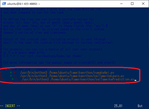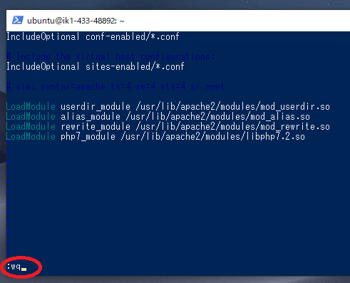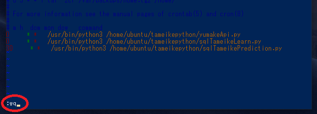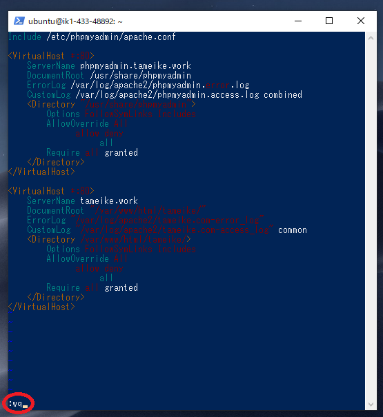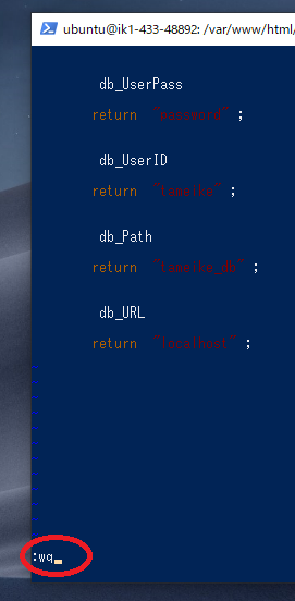 入力完了後「ESC」キーを入力しINSERTモードを終了し、「:wq」を入力後「Enter」キーを入力し、保存します。